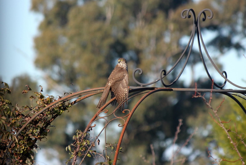 He flew in and sat on the rose arbour for a few minutes then decided to move on. As his common name would suggest, the Collared Sparrowhawk feeds on small birds, the largest recorded bird taken has been crested pigeon and spotted bowerbird.