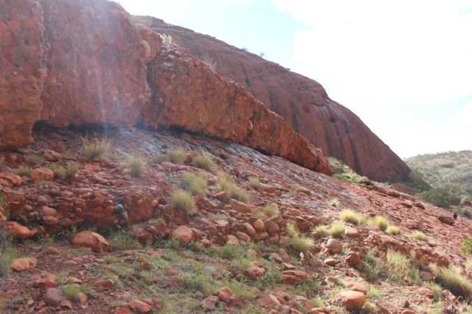 The remarkable thing about Kata Tjuta is that it’s composed of a different type of rock than what Uluru(made of sandstone) is which is only 50 kilometres away(by road, 32 as the crow flies).  Katu Tjuta is a conglomerate, a gravel consisting of pebbles, boulders and cobbles cemented by sand and mud.  Conglomerate is also a sedimentary type rock.  From a distance Kata Tjuta looks like the other big rock just around the corner, but up close its quite rough, see below photo.