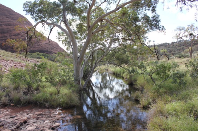 Kata Tjuta is a Anangu mens site and sacred under traditional law, which means for us tourists there is no wandering off the pathways.  There are plenty of different walks here and lots to see, so as we meander along, please stay with me!  No wandering off!  Note in the above photo the puddle of water which is a byproduct of rain we had here the day before.  If you have read part 11 of this series you would realise this, but now we were enjoying the crisp sunshine, it is winter by the way!  A balmy 17 degrees Celsius!  You can see a bunch of people above, and to their left a green patch.  I will concentrate on that now, the patch that is.