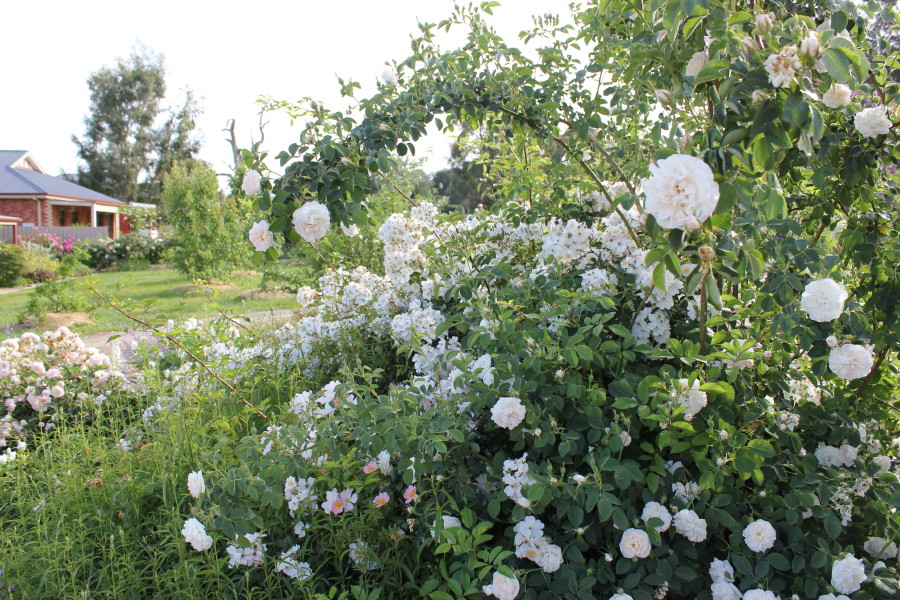 Pure white flowers that can sometimes have a hint of cream in them. Flowers are very double and have an excellent perfume. Grey-green foliage on a shrub to 1.8-2.2 x 1.2m. Branch’s are arching over in spring with the weight of the flowers. Lovely large healthy shrub that flowers in late spring and follows with some red hips in Autumn. An Ancient rose from Europe, 15th century or earlier with lots of other names attached to it. Maxima, Jacobite Rose, Bonnie Prince Charlie’s Rose, White Rose of York, Great Double White, Cheshire Rose