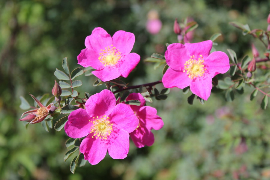 Superb shrub to 1.8 x 1.8m with fern like foliage. Single flowers are deep pink with cream anthers followed by small pear shaped reddish hips. Discovered in Western China 1904