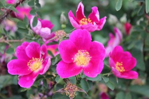Not a true species rose but a seedling of R. spinosissima. Beautiful dark pink-purplish flowers followed by black hips in Autumn. Small shrub 1 x 1m. Original species found in Europe pre 1600. This variety around the 1800’s