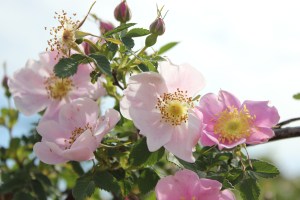 Superb shrub with bright lilac pink flowers followed by round red hips in Autumn. 1.5 x 1.5m very thorny shrub. Discovered N.America 1888