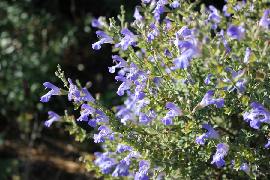 A great little Salvia from the Cape of Good Hope in South Africa that grows to about 50 x 50cm with small olive-green leaves. Violet blue flowers are born in two’s or three’s on short stems. Very tough plant that is drought tolerant and frost doesn’t bother it at all as well. Flowering from summer through to winter. A well-drained sunny position would suit, although I have one in part shade as well and its does fine as well. It is stretching for the sun a bit though. Easily grown from cuttings. Discovered by John Muir in the late 1920’s.